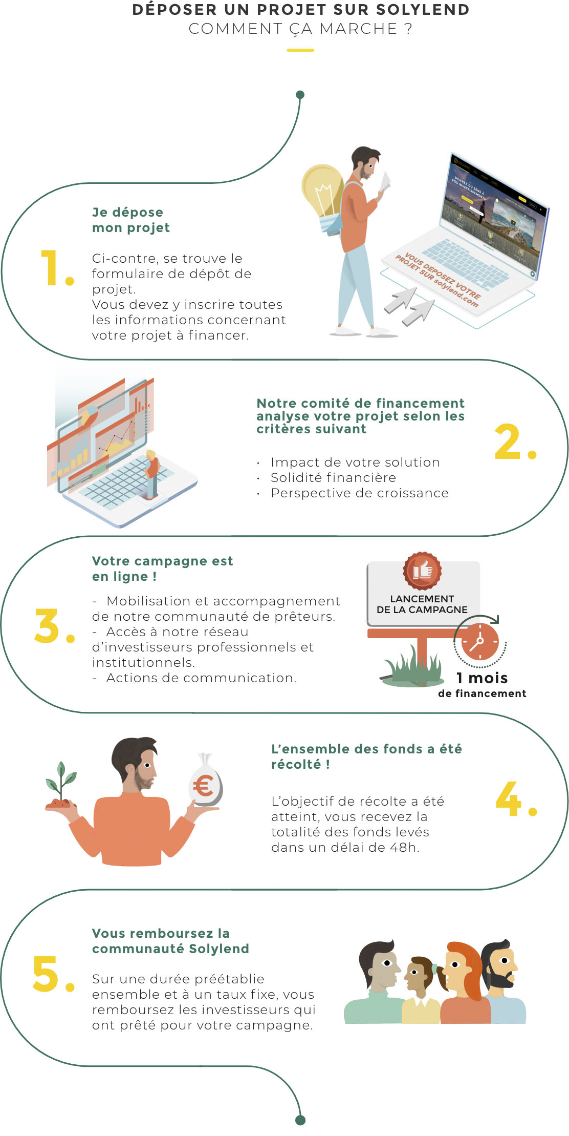 Solylend doit comprendre : quel est votre projet, que recherchez-vous, pour quoi faire, quand, où, qui porte le projet, où en êtes-vous, sur quels sites ou quels réseaux peut on vous suivre ou obtenir des compléments d’informations, quelle est l’utilité ou l’impact de votre projet ?